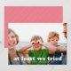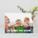 Esta divertida tarjeta de fotos de vacaciones presenta una foto horizontal de sangre completa con el saludo "al menos lo intentamos". Este diseño se adapta a una foto horizontal. El COLOR de saludo es COMPLETAMENTE EDITABLE - sólo tiene que hacer clic en "Click to personalizar more" (Haga clic para más ) en el menú desplegable de personalización! Puede hacer un personalizar aún mayor de este diseño cambiando el color de fondo tanto en la parte delantera como en la parte posterior, además de añadir otra foto o texto adicional al fondo. Esta tarjeta graciosa es perfecta para una familia con niños tontos o cuando la foto de la familia planificada no resulta muy correcta.