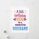 ¡Muéstrale a tu esposo lo mucho que significa para ti con esta vibrante y sentida tarjeta de cumpleaños! Con el audaz mensaje "Un gran abrazo de cumpleaños a un esposo maravilloso" en el frente, es una manera perfecta de celebrar su día especial. En la parte trasera hay un espacio de personalizable donde se puede añadir su nombre en un corazón dibujado a mano para darle un toque personal. ¡Perfecto para los maridos que merecen todo el amor en su cumpleaños!