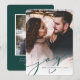 Nuestra sencilla y elegante tarjeta fotográfica navideña incluye tu foto favorita de sangrado completo vertical o orientada a retratos, que se desvanece a blanco en la parte inferior. "Alegría" aparece como un texto de escritura verde de cazador festivo junto con sus nombres o apellido, y el año. Personalizar la parte posterior verde oscuro sólido con dos fotos adicionales y un mensaje personal si lo desea.