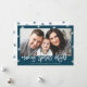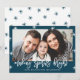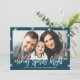 Celebra la temporada navideña con tarjetas de fotos personalizados. El moderno diseño de vacaciones cuenta con un esquema de color blanco y marino, gráficos de estrellas festivas, superposición de tipos de letra de guión de moda y marcadores de posición para una foto y un texto. La tarjeta es perfecta para celebrar Navidades, Hanukah o Año Nuevo.
