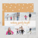 Tarjetas fotográficas de vacaciones personalizadas que incluyen "hacer brillantes los espíritus" en caligrafía de escritura de pincel dorado brillante y 5 fotos familiares. La parte posterior presenta un patrón de nieve en color oro plano vibrante, con un mensaje opcional más largo que puede personalizar con sus propios saludos de vacaciones o noticias familiares.