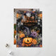Foto de la tarjeta Happy Halloween con una calabaza sonriente usando un gorra negro de brujas y flores moradas y naranjas. Personaliza fácilmente esta tarjeta de Halloween con tu foto y el nombre de la familia.