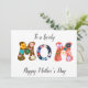 Esta hermosa tarjeta del Día de la Madre deletrea la palabra Mamá con letras coloridas personalizadas llenas de hermosas flores. El dorso tiene un texto preestablecido que puedes mantener o cambiar. Los tonos rosados, azules, marrones, blancos y amarillos hacen de esta tarjeta el regalo perfecto para mamá.
