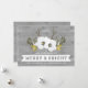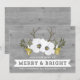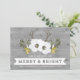 Tarjeta de personalizable para navidades merry y brillantes para su hijo y su hija en la ley en un marco rústico de madera gris, con flores festivas blancas, plateadas y doradas y corbatas de ciervos.