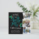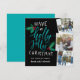 Una carta de fotos de vacaciones rústica y caprichosa en una forma cuadrada única presenta tres fotos en un diseño de collage. A la izquierda aparece la tipografía con letras verde azuladas blancas y vibrantes sobre un fondo negro acentuado con hojas y bayas grises rojas y verdes. Personaliza con tus nombres debajo. Un diseño vibrante y colorido en ricos tonos de joyas que harán que su tarjeta de vacaciones destaque de la manada.