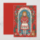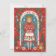 Ilustración caprichosa al estilo del día de San Valentín que presenta a una niña con cabello trenzado, un suéter rojo y un vestido con estampado de tulipanes, enmarcado por un borde floral. Ella sostiene un regalo mientras estrellas y corazones la rodean.