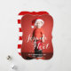 Joyeux Noël | Tarjeta fotográfica de vacaciones contemporánea. Diseño de superposición de texto de ELKE CLARKE© PARA MONOGRAMGALERY en Zazzle. Los saludos de sus seres queridos son fáciles con esta versátil y simple tarjeta de fotos de vacaciones con las palabras "Joyeux Noël et Meilleurs Voeux" escrito en un texto con letras blancas sobre su foto familiar favorita. Reemplace la foto de ejemplo con la suya propia. Patrón de rayas rojas y blancas en la parte posterior de la tarjeta. Otros colores disponibles en la tienda o bajo petición.