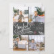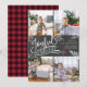 La hermosa tarjeta fotográfica basada en tipografía muestra cuatro de tus fotos familiares cuadradas favoritas en un diseño de collage. "Deseos alegres" aparece en el centro en una tipografía con letras blancas en un fondo de pizarra gris a carbón, acentuado con hojas esbozadas blancas y bayas grises. Personalizar con su saludo personal, nombres de familia y nombres individuales. Las tarjetas se revierten a un patrón de nieve blanca y estrellas en un fondo rojo arándano.
