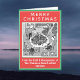 Tarjeta de Navidades divertidos con una escena que muestra una mesa de cena que colapsa bajo el peso de toda la comida. ¡Un hombre rociando pimienta es la causa! Divertido ilustracion personalizado de Navidades en una tarjeta de Navidad.