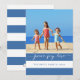 Envíe sus saludos navideños de 2014 a la familia y amigos con esta versátil, apacible, audaz, moderna tarjeta de fotos navideña con las palabras "Paz, Alegría, Amor" escritas en letra de escritura blanca con audaz patrón rayado. Diseño contemporáneo de ELKE CLARKE© PARA MONOGRAMGALERÍA. Fondo a rayas azul y blanco colorido en la parte posterior de la tarjeta. Otros colores disponibles en la tienda o bajo petición en www.zazzle.com/monogramgallery. Reemplace la foto de ejemplo con la suya propia.