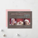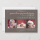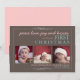 El mensaje de vacaciones dice 'paz, amor, alegría y besos, es<baby's>primera Navidad' en este diseño muy dulce que está personalizado con el nombre de tu bebé y que incluye tres fotos. En coral y verde azulado sobre un fondo marrón mocha de moda, es divertido y definitivamente único.