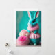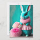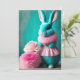 La fantástica y surrealista tarjeta plana de Pascua cuenta con un adorable conejito verde azulado tintado y esponjoso vestido rosa con hermosas flores de primavera. Creado mediante software generado por IA.