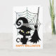 Este pequeño gato está "limpiando las telarañas”. Aquí hay un diseño caprichoso con un gato negro y una escoba. En un naranja brillante están las palabras “Feliz Halloween”.