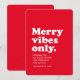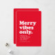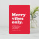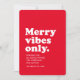 ¡Feliz Navidad sólo esta temporada! Envíe una tarjeta de vacaciones de estilo retro con este diseño divertido y divertido. El tipo de retroceso dice "sólo alegres vibraciones" y también tiene espacio para un mensaje personalizado, nombre y año. El dorso rojo festivo de coordinación tiene una textura angustiada para completar el aspecto vintage.
