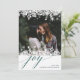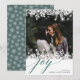 El diseño elegante y moderno de las tarjetas de vacaciones incluye tu foto favorita enmarcada en la parte superior e inferior por un borde de ilustraciones blancos de copos de nieve. "Alegría" aparece debajo de la letra de moda caligráfica. Personalice el saludo de su personalizado y los nombres en la parte inferior derecha. Las tarjetas cambian a un patrón de copos de nieve coincidente en verde abeto rico.