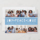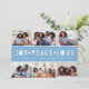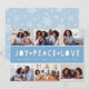 Comparte seis fotos favoritas con nuestra cédula de festividades. Una tira central azul invernal dice "alegría, paz, amor" en letras blancas recortadas con tus nombres y el año bajo.