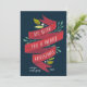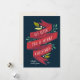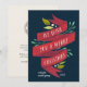 Elegantes tarjetas de vacaciones planas para su negocio presentan "te deseamos una feliz Navidad" en tipografía con letras a mano en una cinta color agua roja acentuada con hojas rojas y verdes y bayas blancas. Personalice con su nombre o nombre de empresa y el año en blanco sobre un fondo azul marino, y añada un mensaje personalizado al dorso, junto con el logotipo de su empresa.