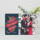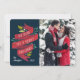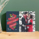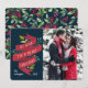 La tarjeta fotográfica festiva incluye tu foto favorita alineada a la derecha, con "te deseamos una feliz Navidad" en una tipografía con letras a mano en una cinta de color rojo con hojas rojas y verdes y bayas blancas. Personaliza con tus nombres y el año.