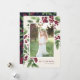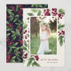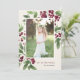 Envíe saludos de vacaciones a amigos y familiares en estilo moda con nuestras elegantes tarjetas de fotos. Graceful sprigs de follaje de acuarela pintada y bayas rojas profundas enmarcan tu foto vertical u orientada a retratos, con tu saludo personalizado (mostrado con "alegría al mundo") y tu(s) apellido(s) escondido(s) en la esquina inferior derecha. Las tarjetas se revierten para revelar un patrón botánico de invierno.