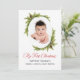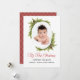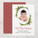 Celebra la primera Navidad del bebé con una tarjeta de vacaciones que incluye una foto de bebé favorita. Este diseño tiene un marco oval adornado con pinos y pinos verdes con escritura roja festiva Mi primer texto de Navidad. El lado inverso de la tarjeta tiene un patrón de arlequín rojo y oro coordinado. Personalice esta tarjeta con la foto de su hijo. Puede editar el texto del saludo de vacaciones con el texto deseado y los nombres.