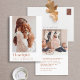 Esta moderna tarjeta de fotos de Acción de Gracias ofrece una manera elegante y sincera de compartir gratitud con sus seres queridos. La parte delantera de la tarjeta contiene una sola foto vertical, bellamente enmarcada por un fondo blanco y nítido. La palabra "Agradecimiento" aparece elegantemente en la tipografía moderna, complementada con el saludo "Feliz Día de Acción de Gracias" y el nombre de la familia en un cálido tipo marrón. Este diseño limpio y contemporáneo permite que la foto se sitúe en el centro del escenario, lo que la convierte en una elección perfecta para aquellos que aprecian la simplicidad con un toque de sofisticación. La parte trasera de la tarjeta continúa con el diseño reflexivo, ofreciendo espacio para otra foto preciada. Este espacio de fotos adicional ofrece la oportunidad de compartir más de tus momentos favoritos del año. También hay un área designada para un mensaje corto y personalizado, que le permite expresar su más sincero aprecio y sus buenos deseos en sus propias palabras. La combinación de elementos visuales y escritos crea un gran tacto que los amigos y la familia valorarán. Esta tarjeta de foto del Día de Acción de Gracias, elaborada con materiales de alta calidad, está diseñada para dejar una impresión duradera. Sus modernos detalles estéticos y cuidados lo convierten en una elección ideal para las familias que quieren compartir su gratitud de una manera contemporánea y elegante. Ya sea que se exhiba en un mantel o se mantenga como un recuerdo, esta tarjeta captura perfectamente el espíritu de la temporada y el calor de sus deseos de vacaciones.