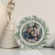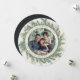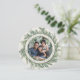 Elegante tarjeta fotográfica de vacaciones en una forma redondeada única cuenta con una foto favorita rodeada por una corona de pino botánico verde exuberante sobre un fondo de marfil cálido de moda. Personaliza con un saludo de vacaciones personalizado (mostrado con "novedades de comodidad y alegría"), y tus nombres se curvaron alrededor de la foto.