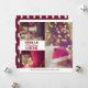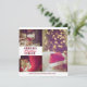 Navidades dispersos Cheer Wine Red Holiday Photo Card con tres fotos y un nombre y año familiar editable delante y un patrón de madera de pino rojo burdeos en la parte posterior