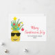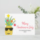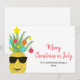 ¿Estás celebrando Navidades en julio de este año? Esta divertida tarjeta de vacaciones está decorada con una piña acuarela, con gafas de sol, y decorada con azulejos y estrellas. Dice Feliz Navidad en julio en una tipografía roja elegante. Personalizable fácil. Acuarela original © Michele Davies.