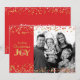 Confeti rojo, blanco y dorado con espacio para una foto y un texto que dice "Enviando alegría a los Navidades". La superposición de confetti se extiende hasta el área de la foto. Este diseño luce genial con un tono sepia o una foto en blanco y negro.