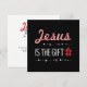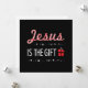 Tarjeta de Navidades cristianos con una moderna tipografía de caña de caramelo que muestra el mensaje "Jesús es el regalo". Inspirado por la escritura de la Biblia: Mateo 1:2. Que siempre recordemos el verdadero significado de los Navidades.