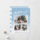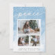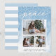 Comparte saludos de vacaciones con estas tarjetas de fotos navideñas de moda con tres de tus fotos favoritas (1 paisaje, 2 cuadrados) dispuestas en un diseño rectangular de collage sobre un fondo de agua azul claro acentuado por la caída de la nieve. "Paz" aparece en la parte superior en elegante tipografía escrita a mano. Personalice con su saludo de vacaciones personalizado, nombre(s) y el año a lo largo de la parte inferior. Las tarjetas cambian a un patrón de rayas en tonos azul pastel y blanco.