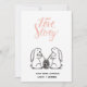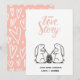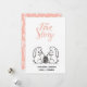 Esta tarjeta del Día de San Valentín presenta ilustraciones de conejitos lindos bebiendo del mismo tazón con un texto personalizado con tipografía cursiva "nuestra historia de amor" y sus monogramas en la parte inferior. El reverso tiene un fondo rosado con corazones artísticos en un patrón continuo