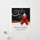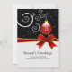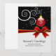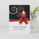 Las tarjetas planas de cinta y de menú de bienvenida de temporada son una plantilla para que usted pueda personalizar con su propio saludo de vacaciones con sus nombres familiares o empleados de negocios. Ornamento rojo en una extraña rama blanca y caída de nieve en el fondo con la imagen de una cinta roja. Estas tarjetas planas de felicitación también son perfectas para tarjetas de vacaciones de empresa y pequeña empresa.