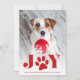 La fantástica tarjeta de fotos de vacaciones incluye una foto favorita de tu perro con "JOY" como un texto rojo sobre la parte inferior. Un ilustracion de papel dulce ocupa el lugar de la "O". Personalice el saludo de su personalizado y los nombres que aparecen en la parte inferior.