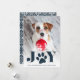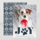 La fantástica tarjeta de fotos de vacaciones incluye una foto favorita de tu perro con "JOY" como un rico texto azul marino en la parte inferior. Un ilustracion de papel dulce ocupa el lugar de la "O". Personalice el saludo de su personalizado y los nombres que aparecen en la parte inferior.
