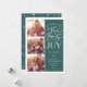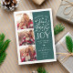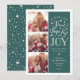 La hermosa tarjeta fotográfica basada en tipografía muestra tres de tus fotos familiares favoritas en formato cuadrado a lo largo del lado izquierdo. "Deseándote paz, amor y alegría esta temporada de vacaciones y siempre" aparece a la derecha en una tipografía con letras blancas sobre un verde fresco fondo salpicado de estrellas festivas. Personalizar con su saludo personal, nombres de familia, nombres individuales y el año. Las tarjetas cambian a un patrón de nieve blanca y estrellas en un fondo verde fresco a juego.