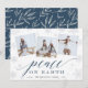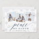 Elegante tarjeta fotográfica de vacaciones cuenta con tres fotos cuadradas en un diseño de collage, con "Peace on Earth" colocado en un humeante guión azul de invierno y letras en bloques con sutiles copos de nieve en el fondo. Personalice su nombre y el año siguiente. Las tarjetas cambian a un fondo con motivos botánicos azules y crema. Una selección moderna y minimalista impresa en un grueso cartón blanco con letras negras.