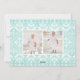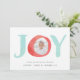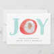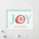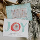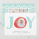 La tarjeta de fotos festiva y caprichosa incluye la palabra "JOY" en letras acuáticas con la foto dentro de la letra "0". Personalice el frente con sus nombres y saludos personalizados, y añada dos fotos adicionales en la parte trasera contra un patrón de vacaciones nórdicas en blanco y verde pastel.