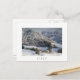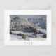 Postal del pequeño pueblo alpino Sankt Magdalena, o Santa Magdalena con una iglesia, algunos chalets y hoteles en el medio del bosque del valle de Funes de los di de Val (Villnoesstal) en la nieve en invierno, el Tyrol del sur, Italia con una frontera blanca y el texto: "Italia". Un gran recuerdo.