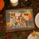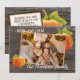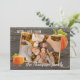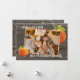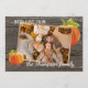 Única, elegante, de moda, bonito y decorativa tarjeta de fiesta de Acción de Gracias. Cute CON AMOR DE texto y habitación a personalizar o personaliza con una foto y nombres (o apellido) de tu elección. Con calabazas clásicas de naranja en una casa de campo rústica de aspecto gris y aspecto templado inspirado en el diseño de fondo de tablas de madera de pino. Y un poema de bienvenida de temporada de personalizable en el reverso de la tarjeta.