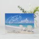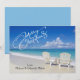 Deseos cálidos de vacaciones desde la playa. En una escritura blanca se dice, "Feliz Navidad". Hay un cielo azul brillante, un océano y una hermosa arena. El océano, de aguas cristalinas, se está estrellando a lo largo de la arena. Hay dos sillas blancas junto al agua. Echa un vistazo a las muchas otras escenas y productos de la playa que tenemos en nuestra tienda.
