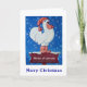 White Rooster o Chicken se para en un poste de madera, con un sombrero de Santa y un pico abierto como si estuviera de canto. Sus pies rojos están en forma de botas rojas. El pájaro se para en un fondo de cielo azul y copos de nieve cayendo. Una figura humorística como personalizado de una vieja huella vintage. Fácil de personalizar y de personalización. Añade tu nombre a la portada, añade un mensaje dentro, compra a granel con gran descuento y envía todas tus tarjetas convenientemente desde este pedido.