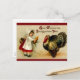 Saludo del día de la acción de gracias del comienzo del siglo XX del vintage. Maíz de ofrecimiento de la niña linda a un pavo.