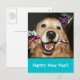 ¡Feliz Año Nuevo! Envíe los sus mejores saludos del Año Nuevo con esta postal, que ofrece un perro lindo del golden retriever que lleva un gorra del fiesta y que sostiene un noisemaker.