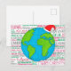 Esta postal se imprime con un globo a mano con un gorra festivo de Papá Noel. ¡El fondo ofrece el refrán "Felices Navidad" en diversas idiomas incluyendo inglés, español, francés, ruso, xhosa, y más!