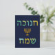 el חנוכהשמח, hebreo para Jánuca feliz, se ilustra en azul, oro y tipografía verde de la acuarela con un menorah de Jánuca del oro en un fondo azul profundo.