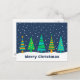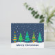 Una hilera de abetos geométricos. El cielo es una marina con nieve blanca cayendo.