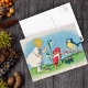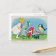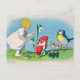 Esta imagen del vintage tiene una niña rubia el hablar con un ejército de pequeños hombres de la seta. Un pájaro dulce se está uniendo a los. Están haciendo una pausa los lirios de pascua blancos y tienen un carro por completo de los huevos de Pascua coloridos. Se están colocando en la hierba verde con un cielo azul bonito detrás de ellos. Vea mi arte de la tienda en marzo para los productos a juego con este diseño.