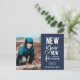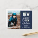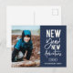 New Year New Adventures, postal de vacaciones. Presenta una moderna tipografía en blanco de moda sobre azul marino con una sola foto delante.
