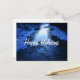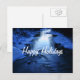 Postal Happy Holidays con un río nevado azul por la noche al atardecer en un hermoso entorno invernal.